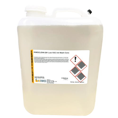KIWOCLEAN 281 LOW VOC INK WASH CONC. is a low odor California SCAQMD compliant (<100 gram/liter VOC) solvent mixture once diluted to working strength with three parts water for the removal of plastisol, water-based and UV screen printing inks.